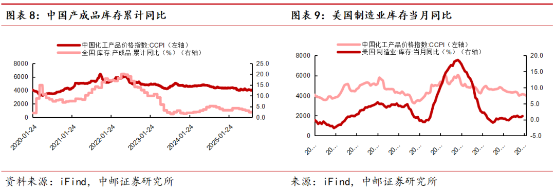库存端,中美均处于累库阶段。2023年3月中国化工品库存增速达到近年高点,为10.7%。此后,行业主动去库存,累库速度放缓,2024年1-12月,中国产成品累计同比增速为3.3%。2025年1-6月,中国产成品累计同比增速为3.9%。2022年5月美国制造业库存增速达到近年高点,为11.30%。此后,美国进入主动去库存阶段,2023年10月-2024年2月美国制造业库存连续五个月出现负增长,2024年11月至2025年4月,美国制造业库存持续转正。