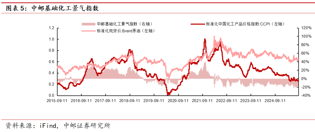 中邮证券基础化工景气指数持续底部运行。我们以Brent原油现货价格作为化工企业表示成本项,以中国化工品价格指数表示收入项,并将两种标准化处理,以两者差值表示化工企业盈利状况,命名为中邮证券基础化工指数。2020年3月—2021年10月基础化工盈利能力处于景气周期,持续时间约19个月,主因是内外需持续向好,叠加行业新增产能有限,行业进入主动补库存周期。2021年10月基础化工盈利出现向下拐点。2022年2月,受俄乌冲突等地缘政治因素影响,作为基础化工行业成本端的原油、煤炭等能源品供需偏紧。与此同时,基础化工行业受出口与内需增速放缓,行业开工率提升、资本开支转固等因素影响,供需偏于宽松,利润向产业链上游集中。此后,成本端供需偏紧,商品端供需宽松局面并未出现较大转变,基础化工行业盈利持续运行底部区间。