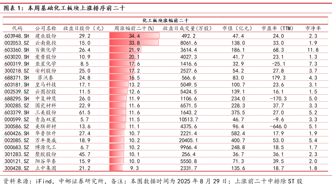 本周基础化工板块上涨排序前二十:建业股份(34.36%)、云南能投(33.84%)、百傲化学(21.93%)、爱普股份(20.11%)、亚星化学(17.61%)、安利股份(17.23%)、菲沃泰(16.47%)、皇马科技(13.25%)、云图控股(12.61%)、中复神鹰(11.88%)、国瓷材料(11.60%)、三美股份(11.59%)、青岛双星(11.50%)、美联新材(11.07%)、华鲁恒升(10.69%)、万丰奥威(10.22%)、博源化工(10.21%)、聚胶股份(10.07%)、阳谷华泰(10.05%)、立中集团(9.33%)。