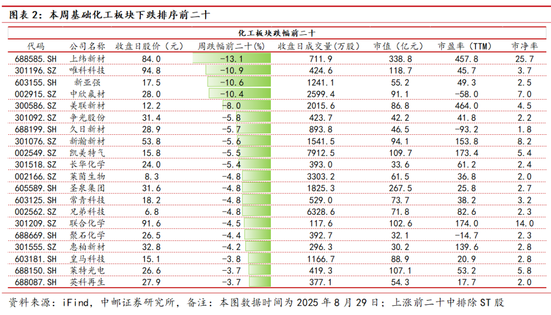 本周基础化工板块下跌排序前二十:飞鹿股份(-25.45%)、阿拉丁(-14.44%)、准油股份(-13.00%)、中研股份(-11.48%)、扬帆新材(-11.02%)、唯赛勃(-10.42%)、华信新材(-10.19%)、美思德(-9.99%)、震安科技(-9.87%)、南京聚隆(-9.77%)、恒大高新(-9.72%)、聚石化学(-9.33%)、天晟新材(-9.18%)、蓝丰生化(-9.09%)、隆华新材(-8.97%)、渤海化学(-8.97%)、*ST亚太(-8.88%)、裕兴股份(-8.85%)、锦鸡股份(-8.70%)、彩蝶实业(-8.40%)。