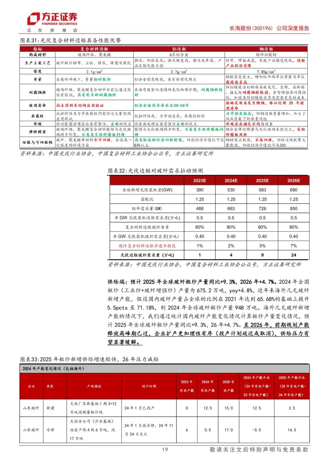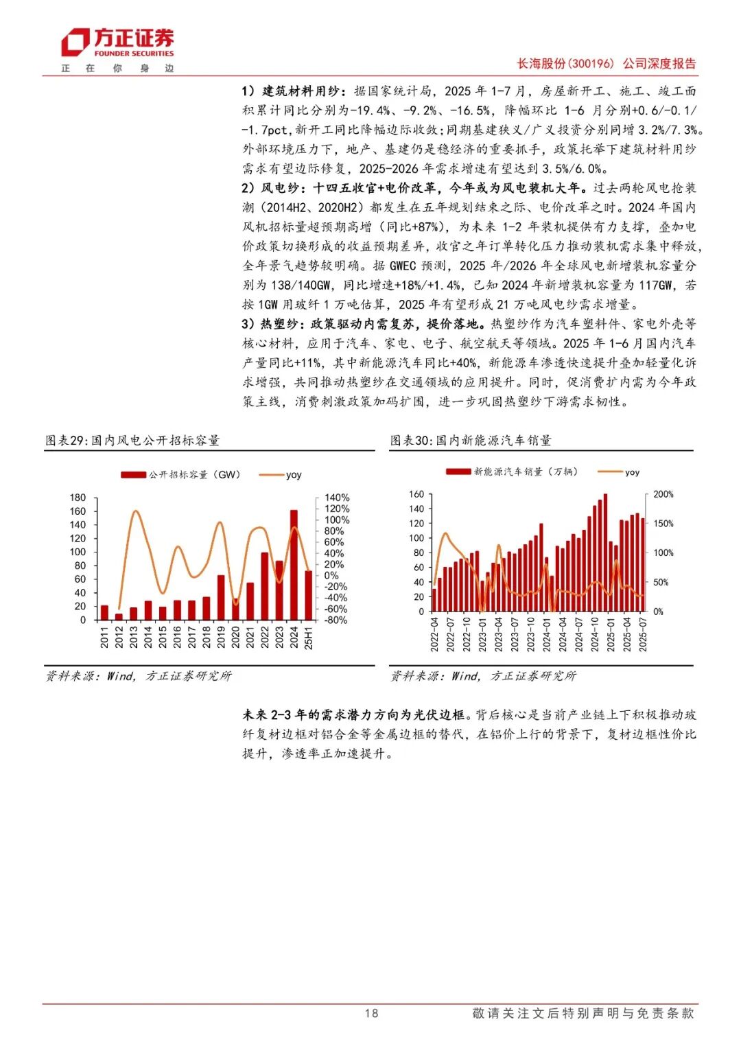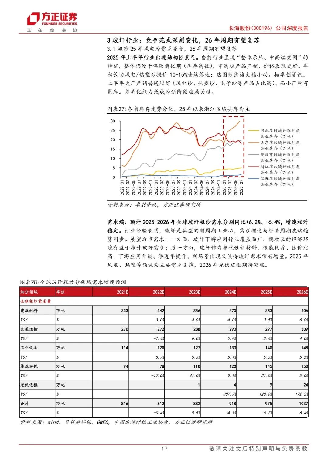 玻纤行业:竞争范式深刻变化,26年周期有望复苏。2025年粗纱全年需求增速预计6.2%,但供给增速或达9.3%,行业仍面临供需压力。2026年供给增速预计降至4.7%,需求增速提升至6.4%,粗纱周期或迎复苏。2024Q1末以来,玻纤行业的竞争范式正经历深刻改变,过往依靠价格战抢夺份额的模式逐渐被行业协同稳价的共识所取代。25年长海玻纤纱有效产能同比净增12万吨,销量弹性或达35%,量的弹性高于行业,公司业绩弹性确定性更高。