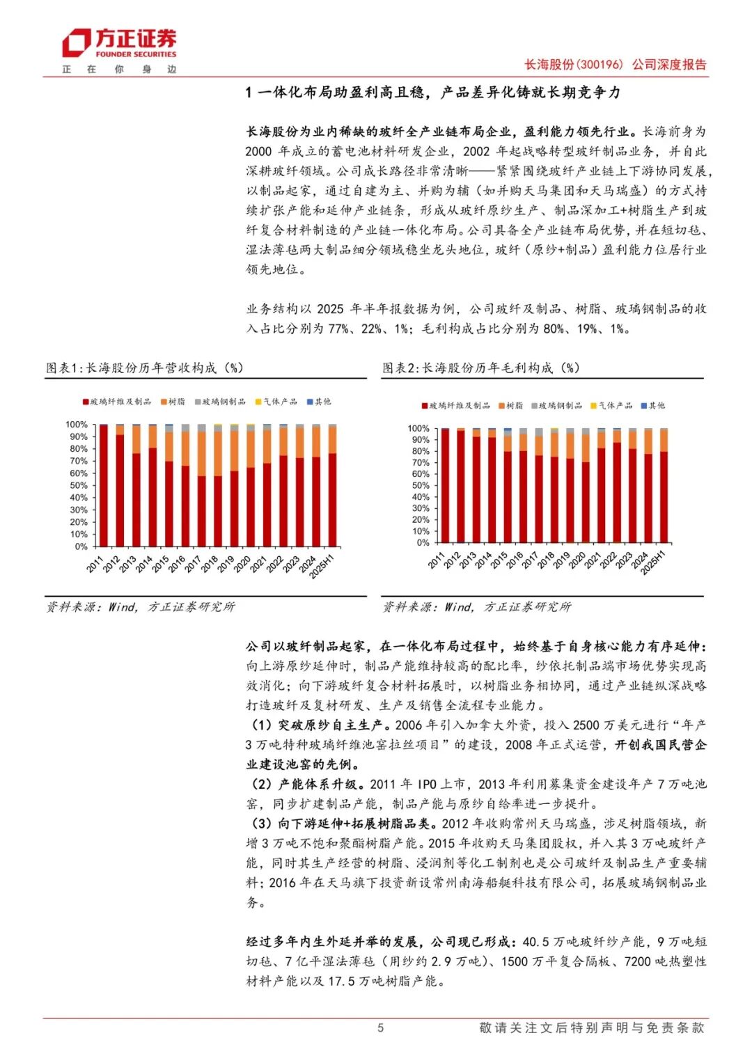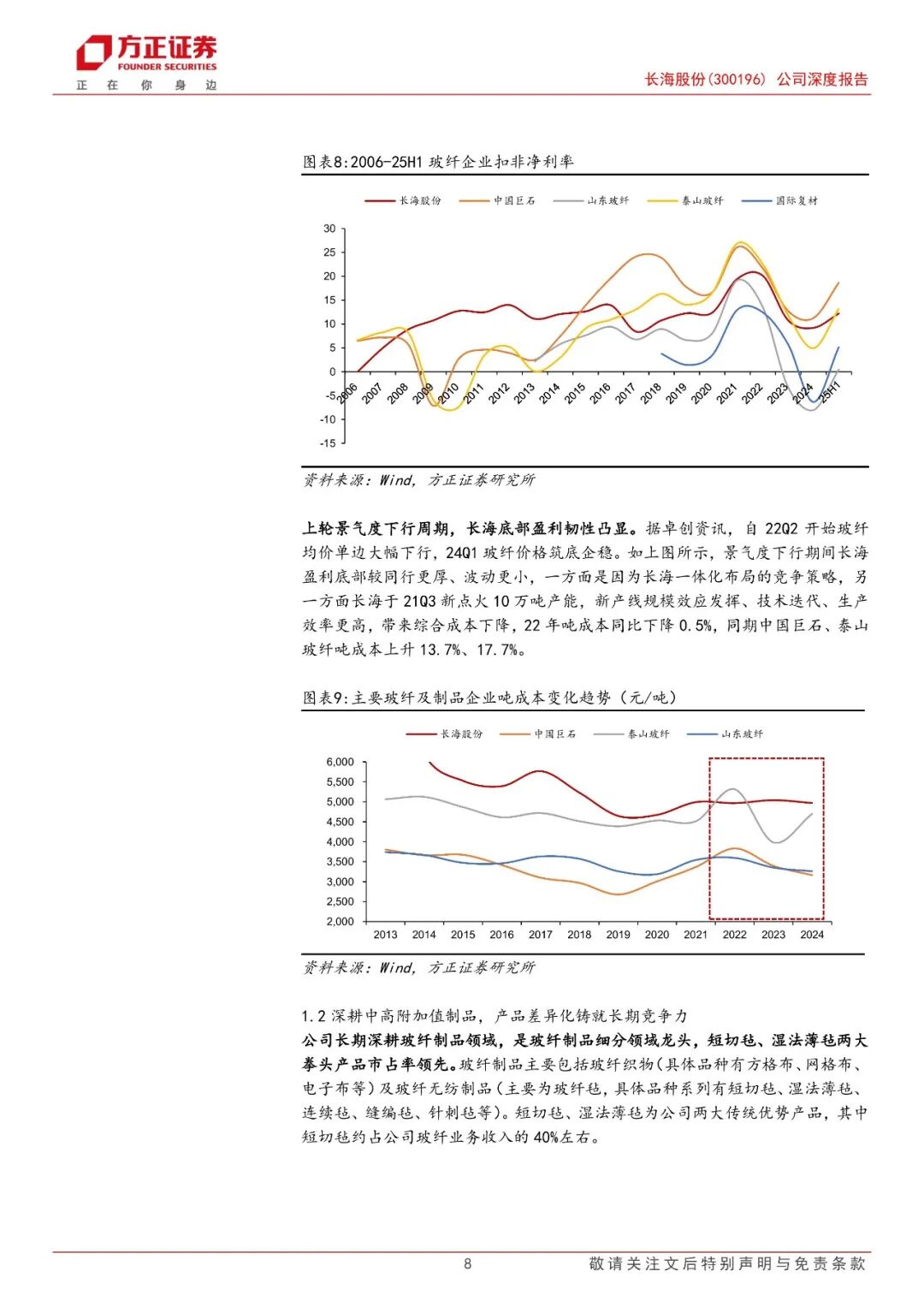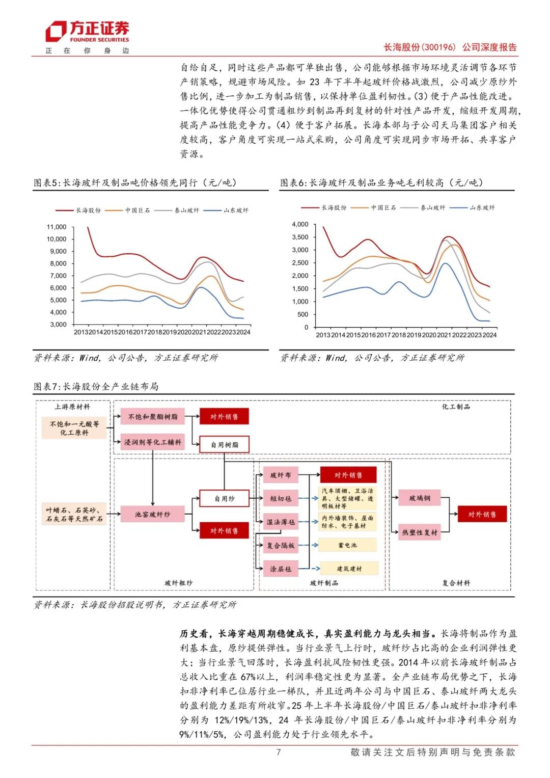 一体化布局助盈利高且稳,产品差异化铸就长期竞争力。长海股份是业内稀缺的玻纤全产业链布局企业,以制品业务起家,通过自建与并购形成“原纱生产→制品深加工→树脂/复合材料制造”的一体化体系。一体化战略带来四大优势:一是增厚盈利中枢,降低原纱及中间环节成本;二是产销灵活,可根据市场环境调节产销策略;三是便于产品性能改进,贯通粗纱到制品再到复材的针对性产品开发;四是实现客户资源协同,市场情报能力强。公司深耕中高附加值制品领域,拳头产品短切毡和湿法薄毡市占率领先。短切毡采用成本加成定价,顺价能力强,毛利率稳定在25%-35%;湿法薄毡与玻纤纱价格关联度低,长协订单占比高,稳价能力突出。近几年公司扣非净利率位于行业第一梯队,并且在景气下行期韧性更强。