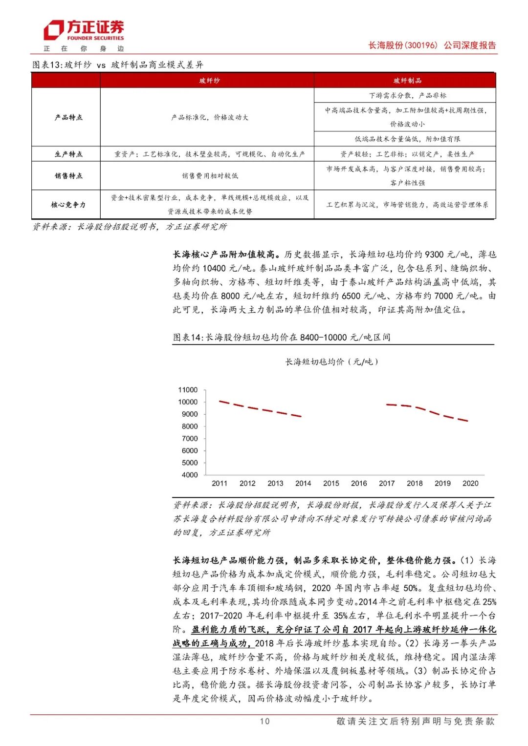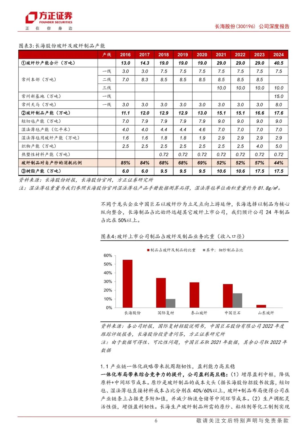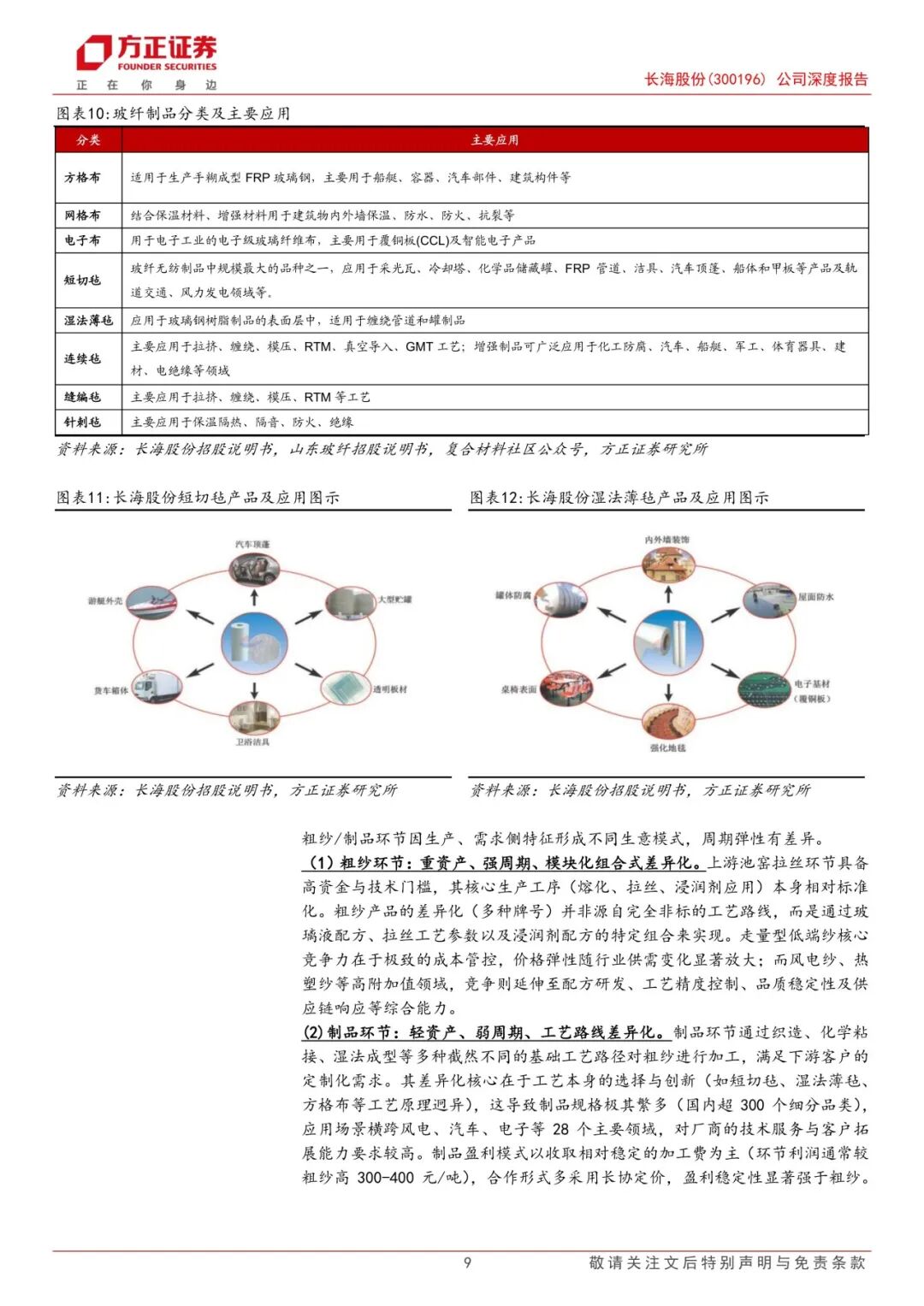 一体化布局助盈利高且稳,产品差异化铸就长期竞争力。长海股份是业内稀缺的玻纤全产业链布局企业,以制品业务起家,通过自建与并购形成“原纱生产→制品深加工→树脂/复合材料制造”的一体化体系。一体化战略带来四大优势:一是增厚盈利中枢,降低原纱及中间环节成本;二是产销灵活,可根据市场环境调节产销策略;三是便于产品性能改进,贯通粗纱到制品再到复材的针对性产品开发;四是实现客户资源协同,市场情报能力强。公司深耕中高附加值制品领域,拳头产品短切毡和湿法薄毡市占率领先。短切毡采用成本加成定价,顺价能力强,毛利率稳定在25%-35%;湿法薄毡与玻纤纱价格关联度低,长协订单占比高,稳价能力突出。近几年公司扣非净利率位于行业第一梯队,并且在景气下行期韧性更强。