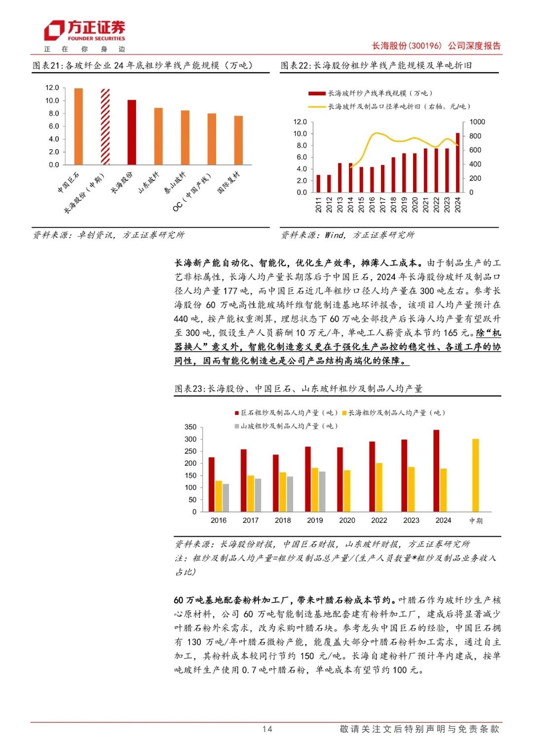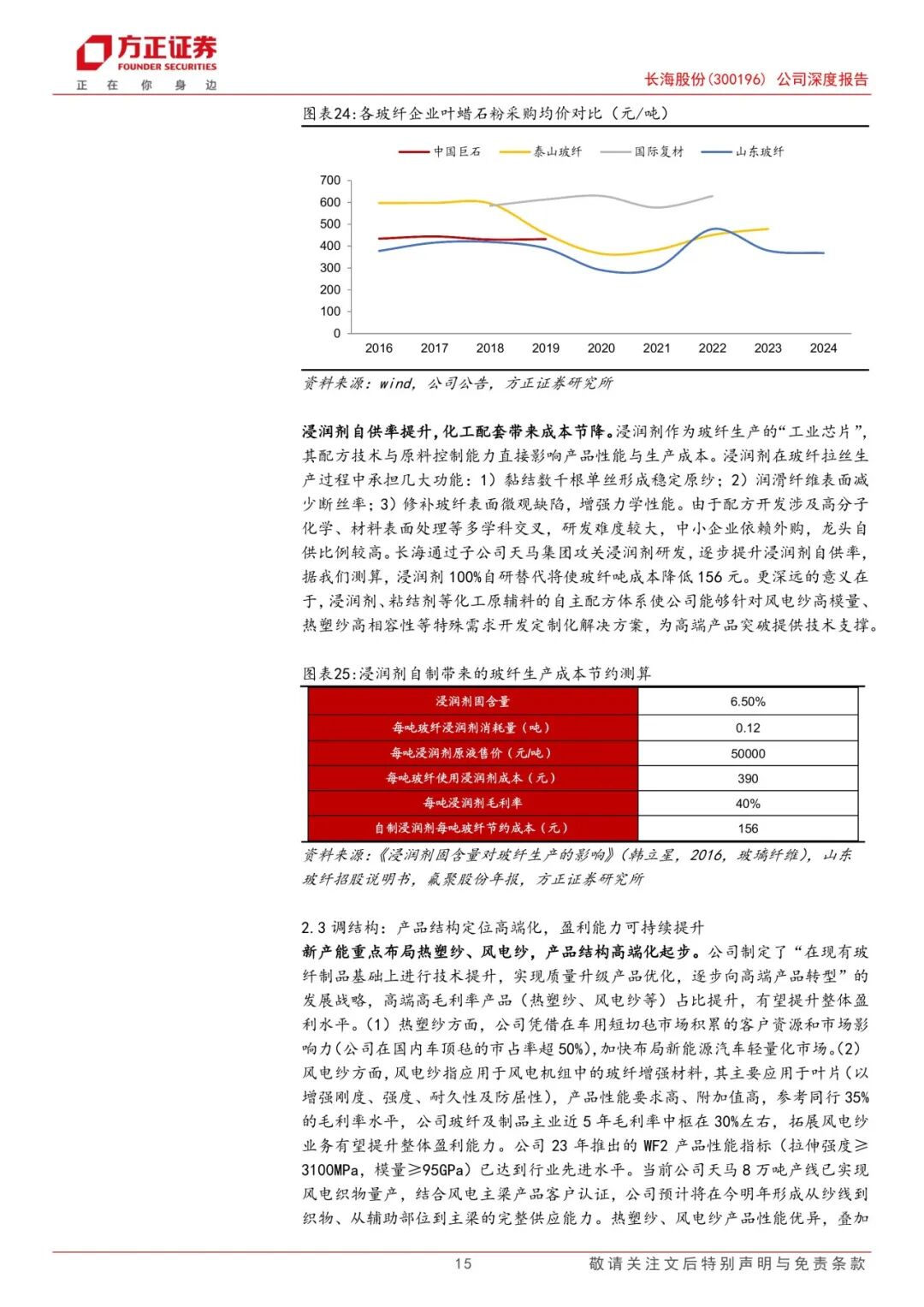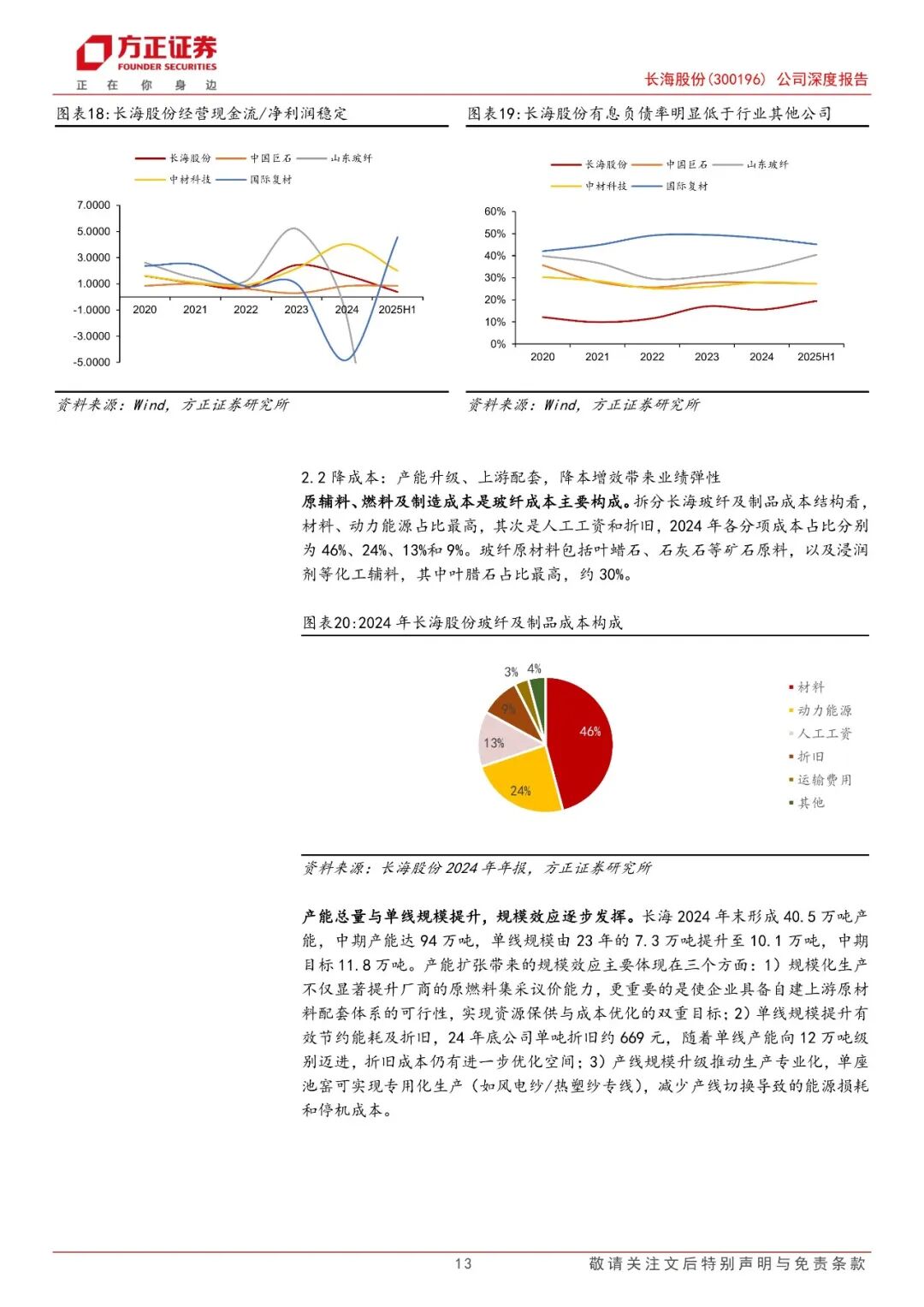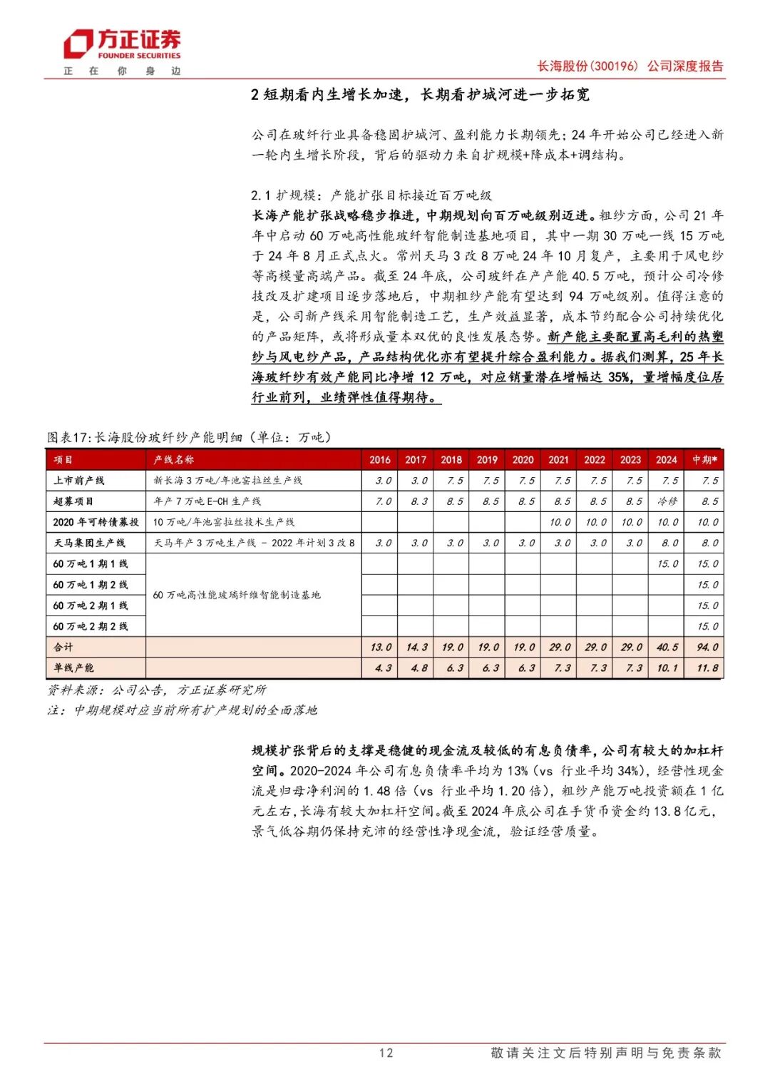 短期看内生增长加速,长期看护城河进一步拓宽。公司通过“扩规模+降成本+调结构”驱动新一轮成长。1)扩规模:2024年底粗纱产能达40.5万吨,中期规划提升至94万吨;2025年销量潜在增幅35%,量增弹性行业领先。财务支撑稳健,2020-2024年平均有息负债率13%(行业34%),经营性现金流为净利润1.48倍,扩产资金充裕。2)降成本:扩产后单线与总规模效应发挥;叶蜡石粉配套加工厂投产后,吨成本预计节约100元;提高浸润剂自我配套率,假设100%自研可降吨成本156元;智能化新产线提升人均产量至300吨,摊薄人工成本。3)调结构:重点布局高毛利风电纱和热塑纱,二者价格较普纱高50%以上。