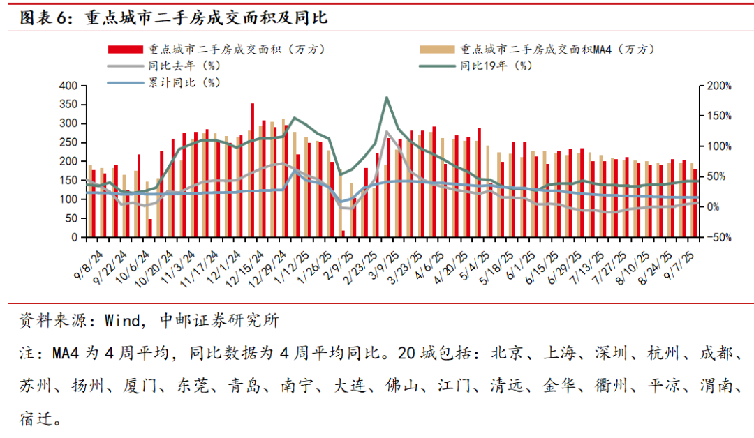 (2)二手房成交及挂牌:上周20城二手房成交面积为195.43万方,本年累计二手房成交面积为7770.11万方,累计同比+15.2%。20城近四周平均成交面积为195.43万方,同比+6.5%,环比-1.2%。截至2025/8/25全国城市二手房出售挂牌量指数为11.87,环比-2.2%,挂牌价指数为152.68,环比-0.07%。