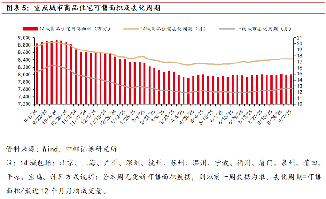 上周14城商品住宅可售面积为8005.69万方,同比-9.48%,环比+0.04%,14城去化周期为17.51个月,其中一线城市去化周期为12.59个月。