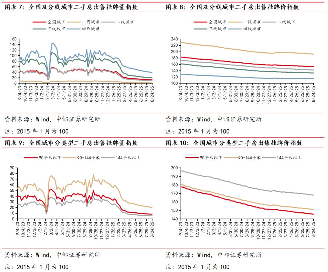 截至2025/8/25全国城市二手房出售挂牌量指数为11.87,环比-2.2%,挂牌价指数为152.68,环比-0.07%。