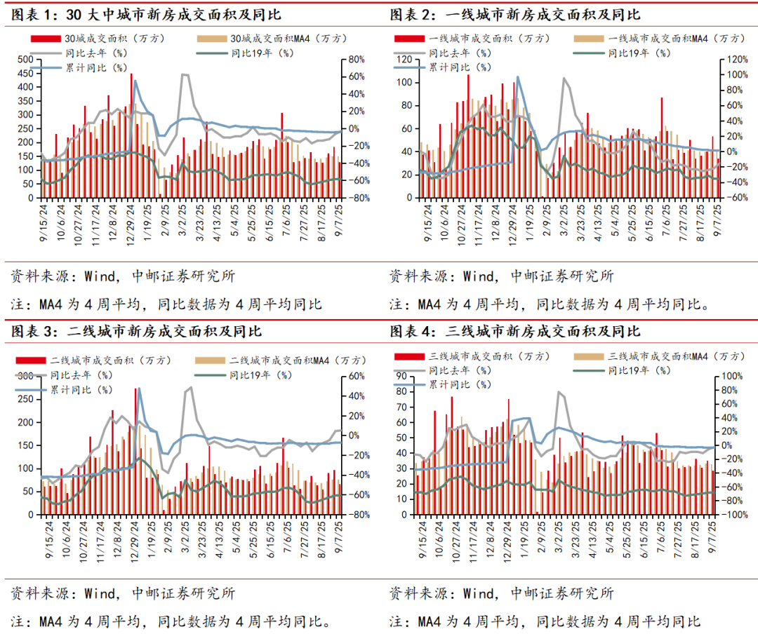 上周30大中城市新房成交面积为150.68万方,本年累计新房成交面积为6102.03万方,累计同比-4%。30大中城市近四周平均成交面积为128.88万方,同比-3%,环比-0.1%。其中一线城市近四周平均成交面积为41.07万方,同比-15.3%,环比+0.2%,二线城市近四周平均成交面积为76.84万方,同比+5.1%,环比+0.6%,三线城市近四周平均成交面积为32.77万方,同比-2.7%,环比-2%。