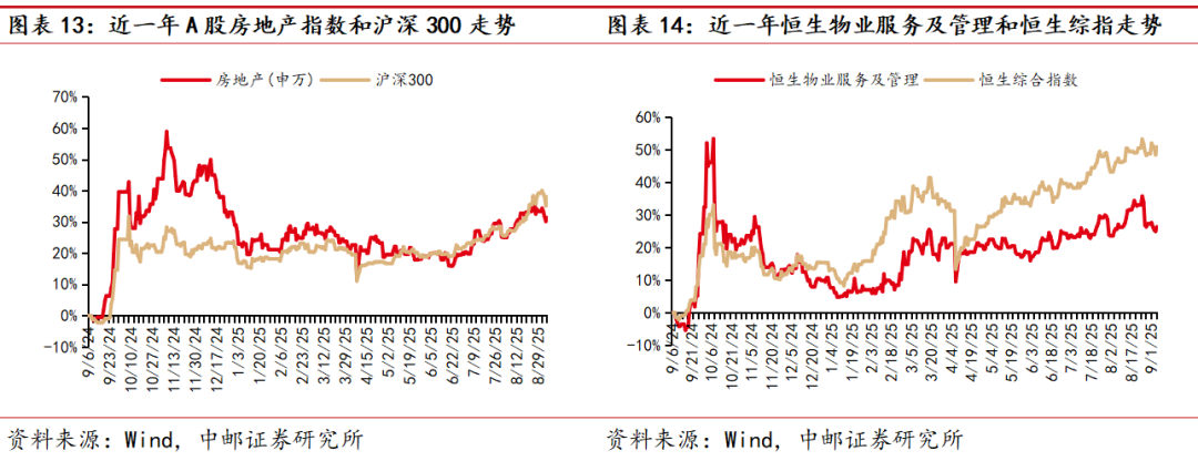 上周A股申万一级房地产行业指下跌1.48%,沪深300指数下跌0.81%,房地产指数跑输沪深300指数0.67pct。上周港股恒生物业服务及管理指数下跌0.69%,恒生综合指数上涨1.47%,物业服务及管理指数跑输恒生综合指数2.16pct。