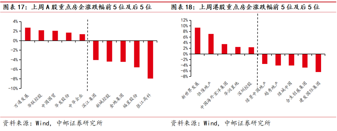上周重点A股房地产个股涨幅居前的分别为:万通发展(维权)(+2.71%)、华联控股(+2.16%)、中国国贸(+2.04%),重点港股房地产个股涨幅居前的分别为:新世界发展(+9.37%)、恒隆地产(+7.2%)、中国海外宏洋集团(+3.54%),重点物业服务企业涨幅居前的分别为:华润万象生活(+2.01%)、金科服务(+1.87%)、碧桂园服务(+0.46%)。