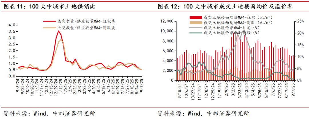 (3)土地市场成交:上周100大中城市新增供应住宅类土地数量为80宗,成交住宅类土地数量为41宗,新增供应商服类土地数量为102宗,成交商服类土地数量为33宗。近四周100大中城市平均住宅类土地成交数量/供应数量为0.5,平均商服类土地成交数量/供应数量为0.49。近四周100大中城市成交住宅类土地楼面均价为5084.5元/平方米,溢价率为5.16%,环比+0.92pct,成交商服类土地楼面均价为1711.5元/平方米,溢价率为0.42%,环比-0.24pct。