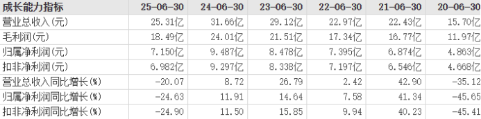然而,受政策环境变化的影响,市场场景缺失,新品推广受阻,口子窖在2025年1—6月(报告期内)的业绩表现并不称心如意。报告期内,口子窖实现营业收入25.31亿元,同比下滑20.07%;归属净利润7.15亿元,同比降幅进一步扩大至24.63%,业绩增速在白酒行业内处于下游水平。