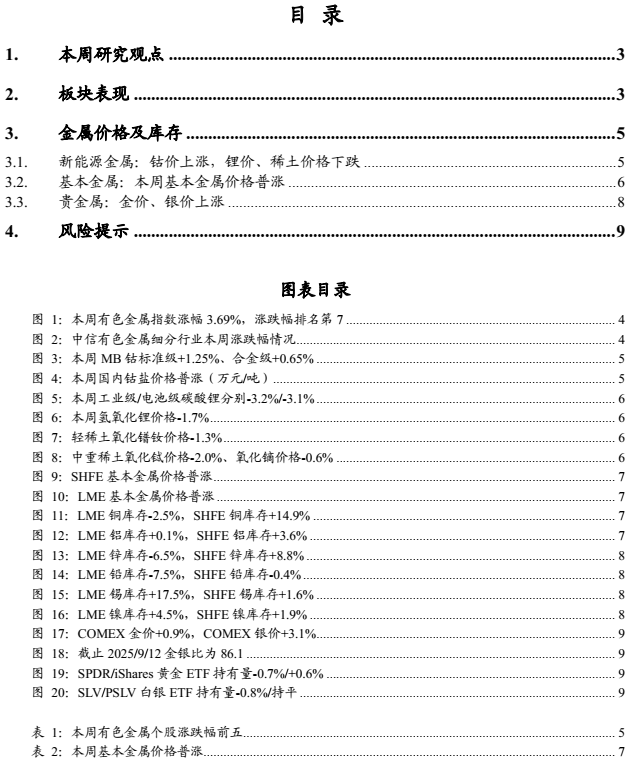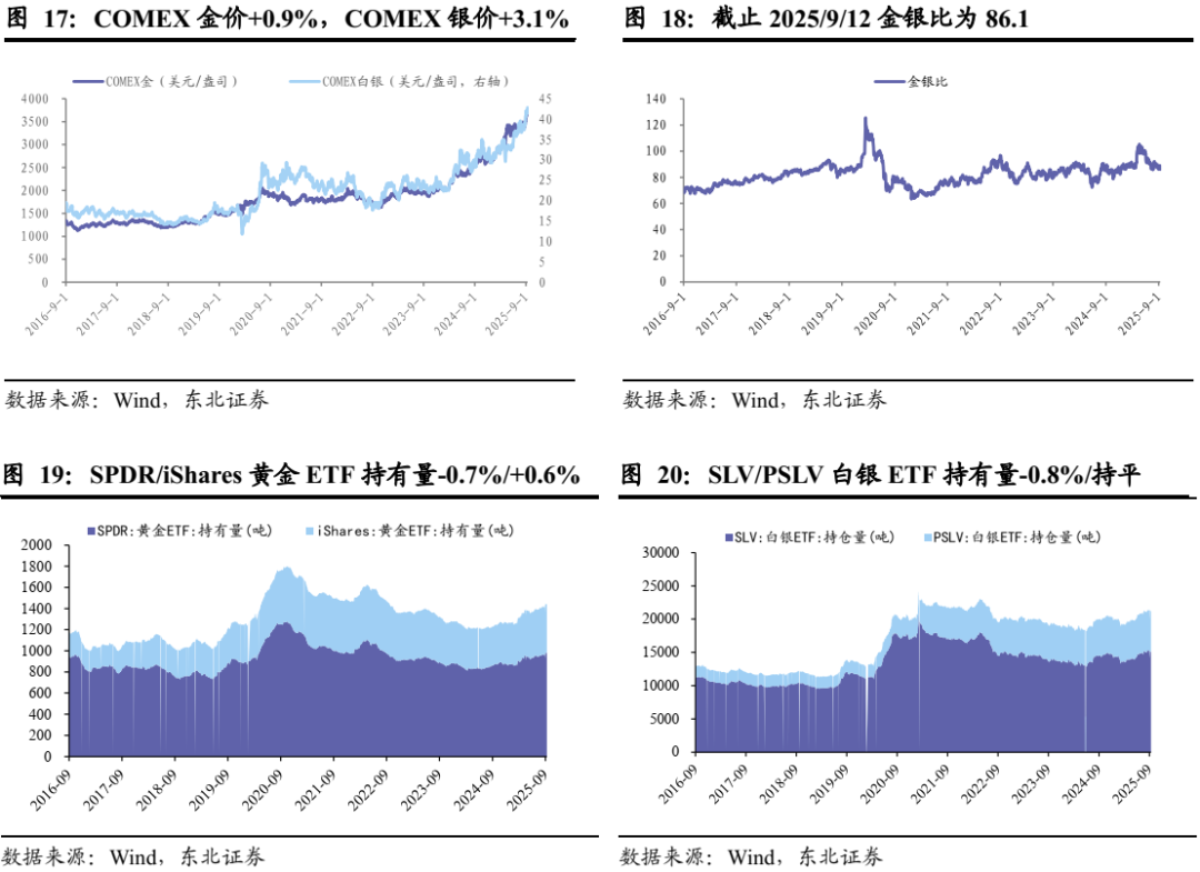 金:通胀符合预期,就业继续偏弱,降息预期不减,继续看多:1)通胀符合预期。美国8月CPI同比2.9%,持平预期,高于前值2.7%;核心CPI同比3.1%,持平预期和前值。CPI环比0.4%,高于预期0.3%;核心CPI环比0.3%,持平预期。分项看:①核心商品环比从0.2%升至0.3%,主要受二手车涨价驱动,而家具、休闲商品等环比读数有所回落,反映关税影响比预期中要更弱;②住房通胀环比从0.2%反弹至0.4%,仍有韧性;③核心服务环比从0.5%降至0.2%,医疗、休闲服务等分项环比读数均下降,或与美国近期就业景气度下降有关。本次通胀符合预期,且结构上看,关税对商品通胀的影响以及核心服务的持续性都没那么强,很大程度上缓解了这次数据的通胀压力,也进一步巩固了降息预期,使各类资产表现都相对较好。2)美国就业数据继续偏弱:9/11美国公布上周初请失业金人数26.3万人,预期23.5万人,前值23.7万人,此外9/9 美国劳工部发布非农就业的初步年度基准修订数据,将2024.4-2025.3的新增非农就业下修91.1万人,平均每个月减少近7.6万人,这也是近十余年来幅度最大的下修,尽管市场此前对此次下修已有预期,但整体就业图景的偏弱也仍然给联储降息提供了更多的理由。近期金价快速上涨,逻辑上与降息预期走强有关,但同时也受益于市场对美国经济状况的预期向下修正(对应2Y、10Y美债利率共同下行,且10Y下行幅度更大)。此外,8月末黄金波动率被压至低点,已积蓄向上能量,而外盘突破前高后动量资金跟随做多,也使得此轮上涨行情流畅,后续继续看多。相关标的:山东黄金、山金国际、赤峰黄金;未覆盖标的:紫金矿业、湖南黄金、中金黄金、西部黄金、招金矿业、恒邦股份、鹏欣资源、灵宝黄金、潼关黄金等。