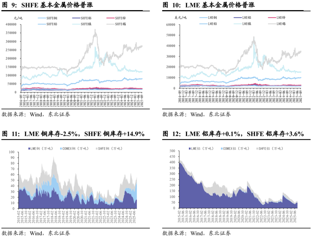 铜:铜价突破1万美元/吨,继续看多铜矿权益资产。1)偏弱的美国经济数据催化,降息交易延续:美国非农数据初步年度下修幅度超预期,美国8月CPI数据符合预期,初请失业金人数就业数据差于预期,整体而言数据指向降息但不足以让市场过分担忧衰退情形,利好铜价。2)供给扰动再现,进一步催化:自由港位于印度尼西亚的Grasberg铜矿突发安全事故,7名井下作业的矿工被困,Grasberg铜矿已暂停运营。Grasberg为全球第二大铜矿,2024年产铜81.6万吨。3)铜矿供给集中度或进一步提升:2025年9月9日,英美资源与泰克资源宣布已达成协议,双方将通过平等合并组建Anglo Teck集团。新公司将成为全球关键矿产领域的领军企业及全球五大铜矿生产商之一。我们认为随着矿端扰动+9月精铜端集中检修+需求端回归旺季,铜的供需或边际改善,叠加降息渐至,未来铜矿股EPS预期和PE均有进一步上修空间。相关标的:洛阳钼业、中国黄金国际、江西铜业、西部矿业。未覆盖标的:紫金矿业、铜陵有色、五矿资源、金诚信等。