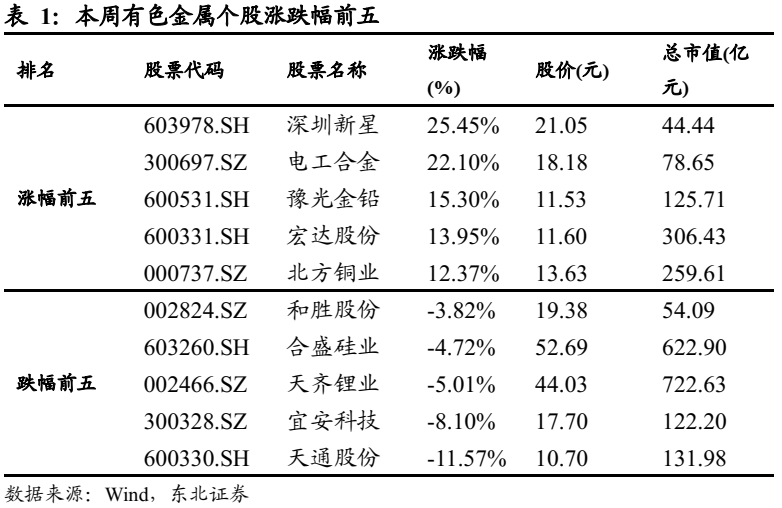 本周上证指数涨幅1.52%,有色金属指数涨幅3.69%,跑赢大盘2.17%,在30个子行业中排名7。有色金属细分板块中表现前三为:铅锌涨幅8.02%,黄金涨幅4.93%,其他稀有金属涨幅4.35%。个股涨幅前三为深圳新星(25.45%)、电工合金(22.10%)、豫光金铅(15.30%)。个股跌幅前三为天齐锂业(-5.01%)、宜安科技(-8.10%)、天通股份(-11.57%)。