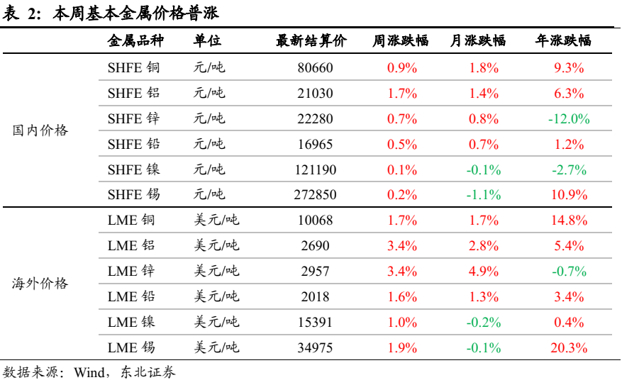 国外方面,LME铜上涨1.72%至10068美元/吨,LME铝上涨3.42%至2690美元/吨,LME锌上涨3.36%至2957美元/吨,LME铅上涨1.64%至2018美元/吨,LME镍上涨1.02%至15391美元/吨,LME锡上涨1.93%至34975美元/吨。