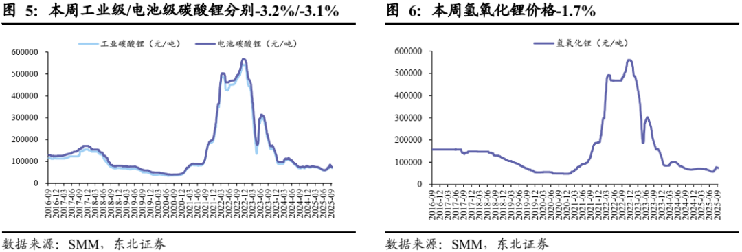 锂:本周,锂精矿价格-3.3%至842美元/吨。锂盐方面,工业级碳酸锂价格-3.2%至7.02万元/吨,电池级碳酸锂价格-3.1%至7.25万元/吨,氢氧化锂价格-1.7%至7.43万元/吨。