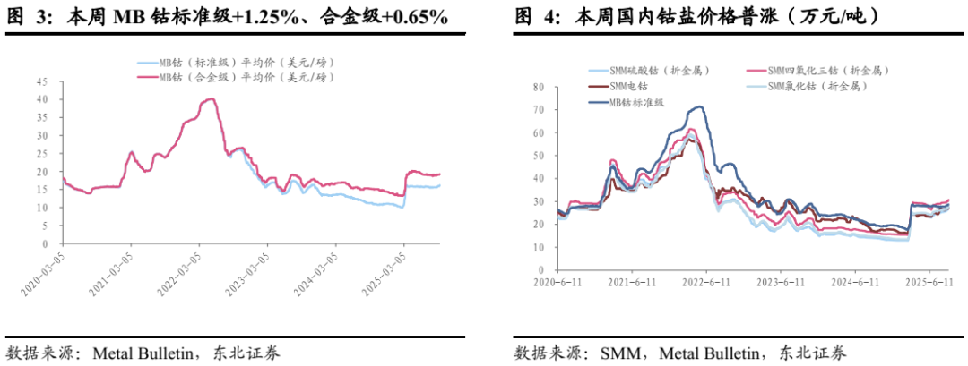 钴:本周,MB钴标准级均价+1.25%至16.15美元/磅,合金级均价+0.65%至19.25美元/磅;国内方面,电钴本周价格+2.06%至27.30万元/吨。钴盐方面,硫酸钴+4.55%至27.46万元/吨,四氧化三钴+2.31%至30.76万元/吨,氯化钴+3.36%至28.00万元/吨。