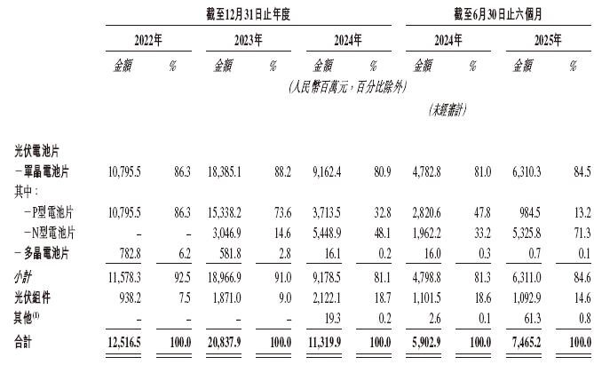 中润光能主要通过中国内地及海外的光伏电池片业务(包括单晶P型PERC电池片、N型TOPCon电池片及多晶电池片)及光伏组件业务产生收入。