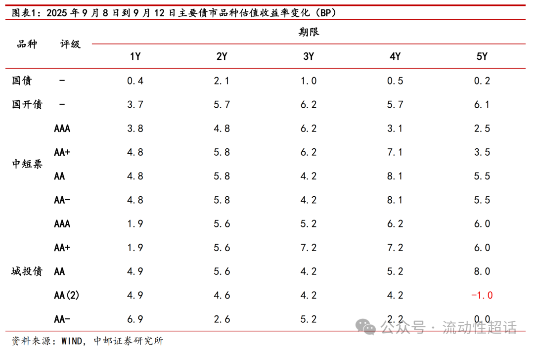 上周债市继续调整,信用债情绪总体较为悲观,调整幅度大于利率。上周前半周股债“跷跷板”效应仍有所体现,叠加基金费率调整的消息使得市场情绪较为低迷,收益率持续上行,10Y国债利率阶段性顶部点位1.80%被突破;后半周,债市对央行重启买债的期待升温,收益率有所修复,但全周来看整体收跌。信用债同步利率走弱,同时多数期限的信用债跌幅超出利率,本轮熊市持续时间较长,信用债抗跌属性较弱。从二级的估值表现来看,2025年9月8日到9月12日,1Y、2Y、3Y、4Y、5Y 的国债到期收益率分别上行了0.4BP、2.1BP、1.0BP、0.5BP、0.2BP,而同期限的AAA中票收益率分别上行了3.8BP、4.8BP、6.2BP、3.1BP、2.5BP,AA+中票收益率分别上行了4.8BP、5.8BP、6.2BP、7.1BP和3.5BP。