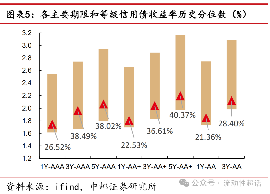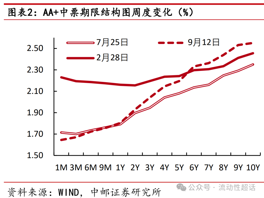 而从绝对收益率和信用利差的历史分位数的情况来看,目前1-3Y特别是3Y左右在调整后具有一定的性价比。2025年9月8日到9月12日,1Y-AAA、3Y-AAA、5Y-AAA、1Y-AA+、3Y-AA+、5Y-AA+、1Y-AA、3Y-AA中债中短票估值到期收益率处于2024年以来的后26.52%、38.49%、38.02%、22.53%、36.61%、40.37%、21.36%、28.40%水平,3Y左右的票息资产有一定性价比。而1Y-AAA、3Y-AAA、5Y-AAA、1Y-AA+、3Y-AA+、5Y-AA+、1Y-AA、3Y-AA信用利差历史分位数分别为后4.22%、30.04%、16.19%、5.39%、24.88%、22.06%、6.80%和16.66%,同样是3Y左右性价比较高。