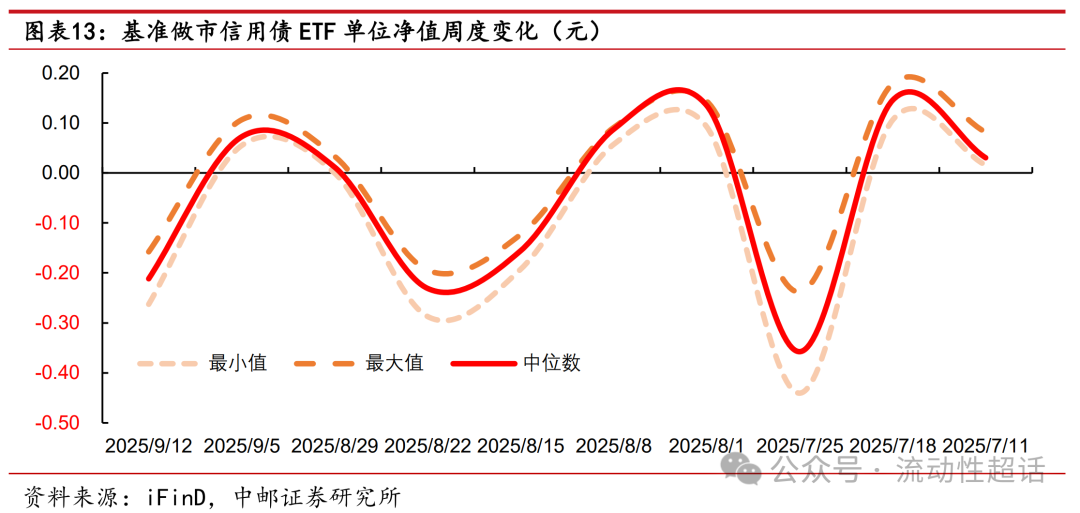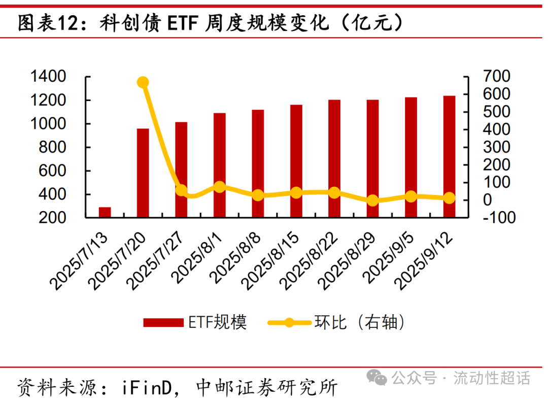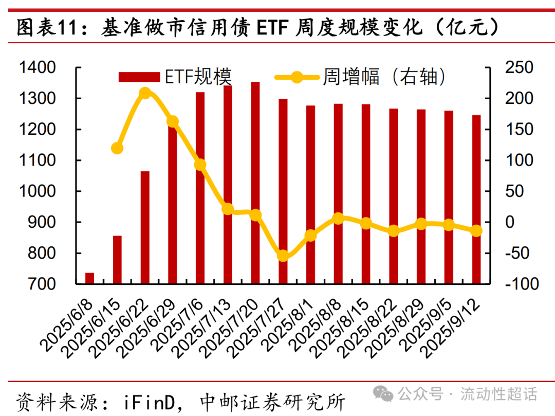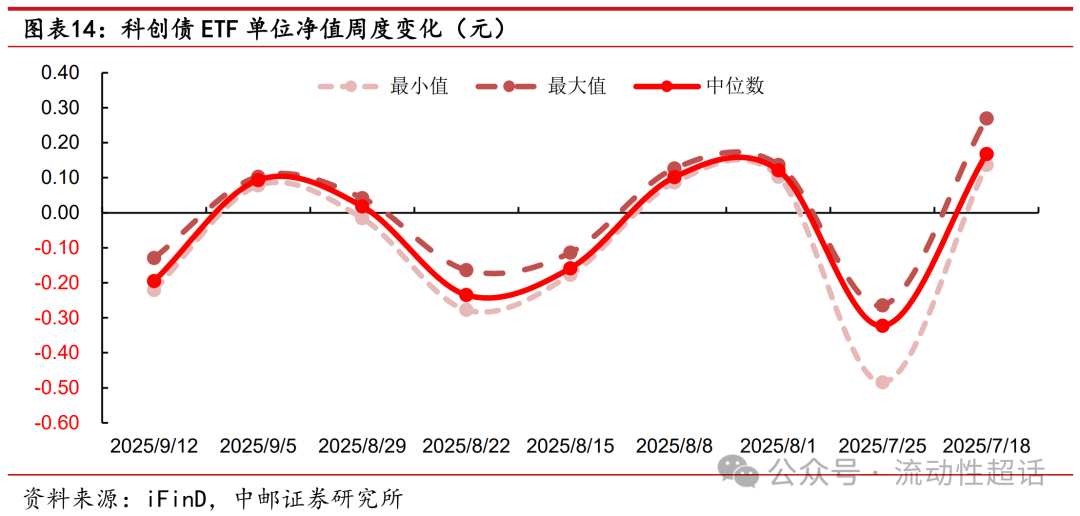 第二批科创类ETF于上周上市,申购情绪较为热烈,或能成为信用行情的边际企稳力量。9月12日,第二批14只科创债ETF启动募集,多数产品申购情况较好,预计募集资金可超过400亿元,预计本周产品规模会继续增长,推动成分券估值“超涨”。但第二批科创类ETF上市对债市的提振情绪目前来看上限不高,已经上市的信用ETF产品上周表现一般,信用基准做市ETF产品周环比规模自8月第二周市场调整开始连续4周缩水,上周科创ETF产品周环比规模明显弱于8月。从单位净值变动来看,上述两类信用债ETF单位净值上周仍在亏损。