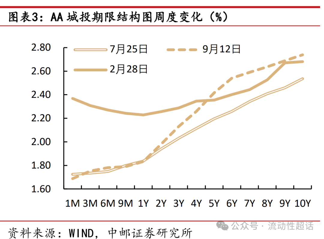 从曲线形态来看,全等级1-2年、2-3年陡峭程度最高,与上一轮急跌后7月底相比2年及以上的陡峭程度要更高,同时5年及以上的部分绝对收益率已经超过今年2月底熊平的位置。以AA+中票和AA城投的收益率期限结构图为例,分别测算一下几个主要期限区间的收益率的斜率情况,取1-2年、2-3年和3-5年三个区间。则对于AA+中票来说,上述三个区间的斜率分别为0.1261,0.1104和0.0774;而对于AA城投来说,上述三个区间的斜率分别为0.1460,0.1517,0.1428。