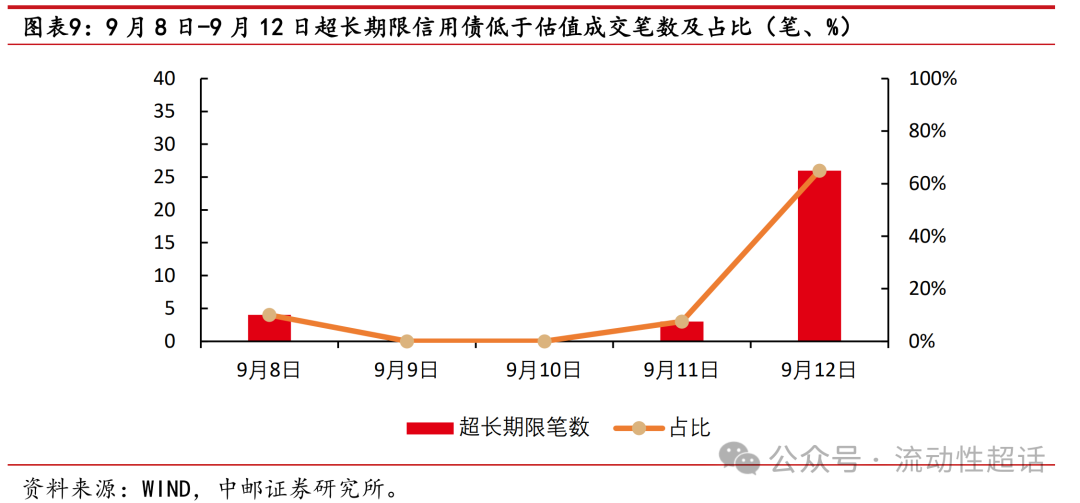 超长期限信用债的机构卖盘行情连续4天走强,仅周五有所好转;从折价成交幅度来看,上周机构对于超长期限信用债的出售心态更加急迫。9月8日-9月12日,超长期限信用债折价成交的占比分别为90.00%、50.00%、92.50%、87.50%、15.00%。从折价成交幅度来看,上周超长期限信用债的折价幅度不小,4BP以上也有成交。此外上周大约25%的折价成交幅度都在4BP以上。
