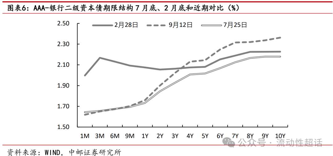 二永债行情同步走弱且“波动放大器”的特征十分明显,1Y-5Y跌幅明显高于普信债,超长期限部分跌幅也高于超长信用债。从曲线期限结构来看,1年以内、7年及以上都较为平坦,2-6年曲线陡峭化最高。1-5年、7年、10年AAA-银行二级资本债收益率分别上行了6.09BP、8.75BP、9.97BP、10.32BP、9.71BP、8.81BP、10.61BP。目前曲线从绝对位置来看3年及以上的部分离2025年以来的收益率最低点位的差距还有32BP-42BP。与上一轮急跌7月底的情况对比,2年以上的收益率点位已经突破新高,调整幅度高于7月底的急跌行情,4年以上的甚至收益率突破了今年2月底的熊平位置。