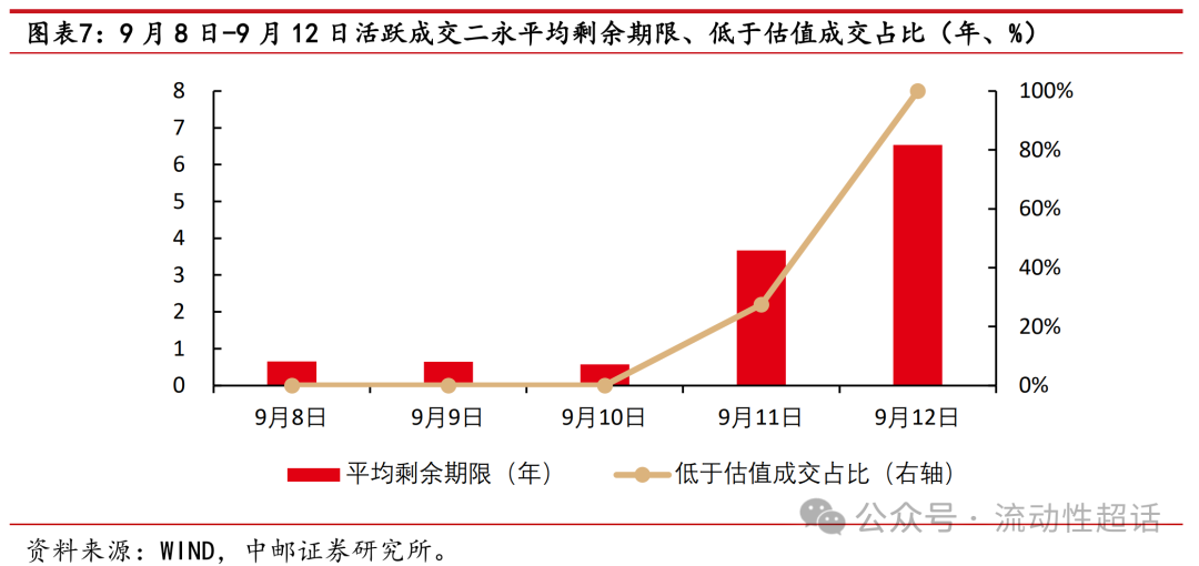 从活跃成交的情况来看,前半周周情绪最为悲观,后半周边际有所好转,但整体而言空头力量较强。9月8日-9月12日,二永债的低估值成交占比分别为0.00%、0.00%、0.00%、27.50%、100.00%、;平均成交久期分别为0.66年、0.65年、0.57年、3.67年、6.54年。从成交幅度来看,上周二永折价成交幅度不算大,仅有8笔折价成交幅度在4BP及上;而低于估值成交情绪更弱,上周低于估值成交幅度均在2BP以内,买入意愿不强。