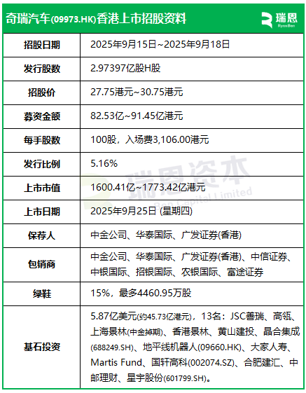 来自安徽芜湖的奇瑞汽车(09973.HK),于今日(9月17日)起至下周一(9月22日)招股,预计2025年9月25日在港交所挂牌上市,中金公司、华泰国际、广发证券(香港)联席保荐。