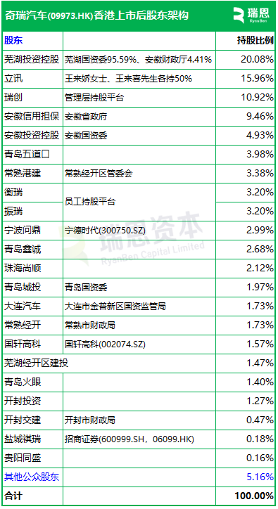 招股书显示,奇瑞汽车在上市前的股东架构中,芜湖投资控股(芜湖国资委95.59%、安徽财政厅4.41),持股20.08%;立讯(王来娇女士、王来喜先生各持有50%,他们为董事王来春女士的胞妹及胞弟),持股15.96%;瑞创(管理层持股平台),持股10.92%;衡瑞(员工持股平台),持股3.20%;振瑞(员工持股平台),持股3.20%;安徽信用担保(安徽省政府全资拥有),持股9.46%;安徽投资控股(安徽国资委全资拥有),持股4.93%;青岛五道口(青岛国资委、即墨国资运营服务中心各自旗下公司为最大LP),持股3.98%;常熟港建(常熟经开区管委会全资拥有),持股3.38%;宁德时代(300750.SZ),通过宁波问鼎,持股2.99%;青岛鑫诚(青岛国资委、即墨国资运营服务中心各自旗下公司为最大LP),持股2.68%;珠海尚顺,持股2.12%;青岛城投(青岛国资委全资拥有),持股1.97%;大连汽车(大连市金普新区国资监管局全资拥有),持股1.73%;常熟经开(常熟市财政局全资拥有),持股1.73%;国轩高科(002074.SZ),持股1.57%;芜湖经开区建投(芜湖经开区管委会全资拥有),持股1.47%;青岛火眼(火眼贝爱(11.52%,GP)、最大LP为华达科技(603358.SH),30.51%),持股1.40%;开封投资(开封市国资委85%、开封市城乡一体化示范区管委会15%),持股1.27%;开封交建(开封市财政局全资拥有),持股0.479%;招商证券(600999.SH,06099.HK),通过盐城祺瑞,持股0.18%;贵阳同盛(郭京军10%、王季文90%),持股0.16%;其他公众股东持股5.16%。