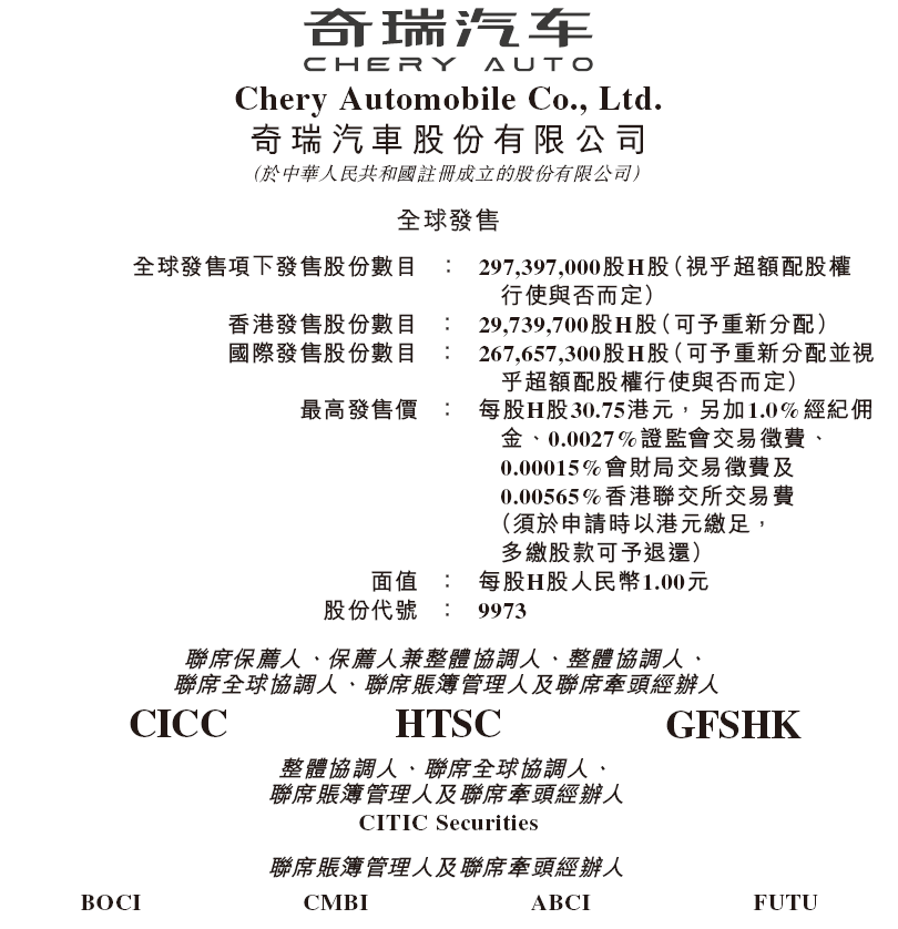 奇瑞汽车是次IPO,中金公司、华泰国际、广发证券(香港)为其联席保荐人,其他包销商包括中信证券、中银国际、招银国际、农银国际、富途证券。