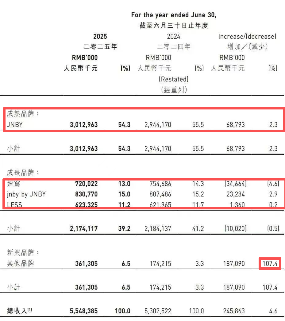 当一个消费者选择JNBY,她很可能会为伴侣选购“速写”,为孩子挑选“jnby by JNBY”童装,为新家布置“JNBYHOME”家居品……江南布衣正是通过这样的品牌矩阵,实现用户在不同人生阶段和场景中的覆盖。财报显示,成熟品牌JNBY营收占比已降至54.3%,速写、LESS及童装等成长品牌贡献39.2%,新兴品牌如蓬马、JNBYHOME更实现107%的高速增长。