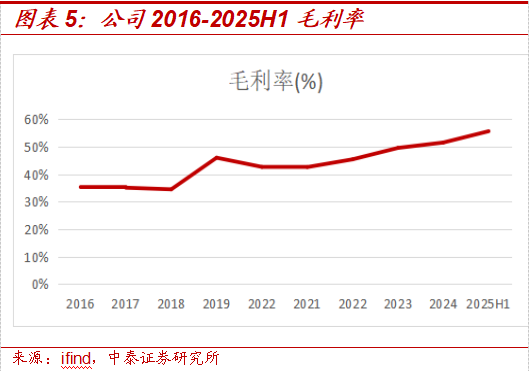 ◼ 公司毛利率整体呈上行趋势,成本控制能力突出。公司2019年毛利率大幅提升至46.03%,同比增长33.34pcts。公司2022-2024年2024年毛利率逐年缓慢提升,2024年毛利率达51.55%,同比提升3.95pcts,成本控制能力凸显。2025H1公司毛利率跃升至55.67%,创近九年新高。