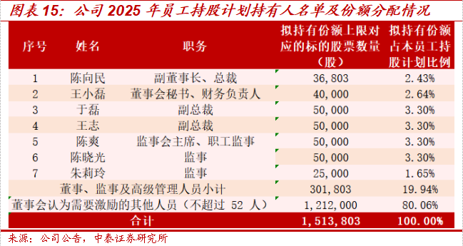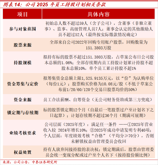 ◼ 公司员工持股计划覆盖核心团队实现利益绑定。2025年公司员工持股计划覆盖不超过59人,含7名高管及核心骨干,拟持有151.38万股标的股票,占当前股本1.06%;总筹资约1525.91万元由员工自筹,股票购买价10.08元/股,锁定期12个月;解锁需满足2025年营收较 2024年增10%或申请发明专利40项,且个人考核合格。