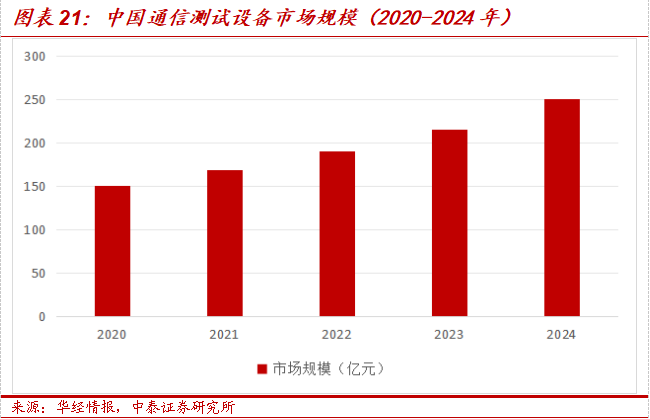 2)行业空间:多技术融合,我国无线通信测试设备市场规模增速领先全球。2024年全球无线通信测试设备市场规模为884.64亿元,2020-2024年全球无线通信测试设备市场CAGR约为5.79%;我国无线通信测试设备市场规模为250.65亿元,占全球的28.34%,2020-2024年中国市场CAGR约为13.13%,显著高于全球均值。