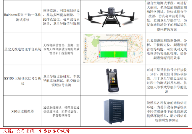 ②网络与频谱测试类产品。110GHz矢量网络分析仪测试系统能测量射频和微波网络散射参数,频率覆盖广、精度高,满足5G、6G等高频段设备及半导体射频器件研发生产测试;EaglePro_无线网络测试软件可对无线网络多维度测试,生成报告为网络规划优化提供数据;Rainbow系列空地一体化测试系统融合空地测试手段,可大范围多场景频谱监测、网络测试,快速排查干扰源、仿真毫米波场景及监测卫星导航信号;星空无线电管理平台系统具备频谱监测数据处理分析、干扰源定位等功能,实现无线电频谱智能化管理。