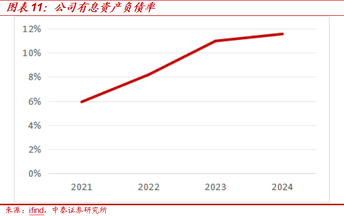 ◼公司2021-2024年期间有息资产负债率呈上升趋势,从2021年的5.93%上升到2024年的11.55%,2024年有息资产负债率达近年最高值。