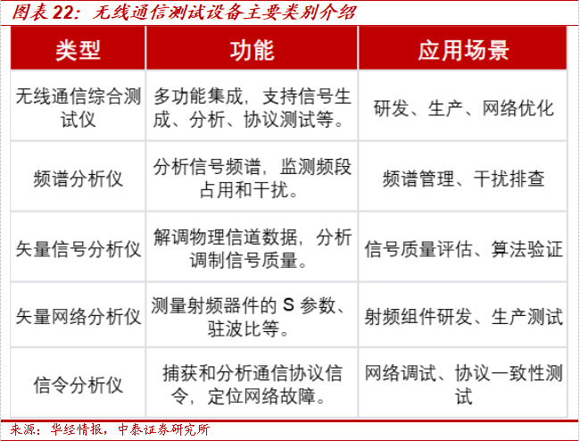 ◼ 无线通信测试设备应用技术多元,更新迭代快。无线通信测试设备是确保无线通信系统质量和性能的关键工具,贯穿通信设备的研发、认证、生产、网络建设及优化全生命周期。它利用电子测量技术,对通信系统的信号质量、频谱特性、网络性能等进行全面评估,保障无线设备符合标准并稳定运行。无线通信测试设备行业主要由测试软件、测试仪表、微波暗室/电磁屏蔽箱等部分构成。它融合了计算机、通信、微电子等多种技术领域,是现代工业产品中新技术应用最多、最快的产品之一。