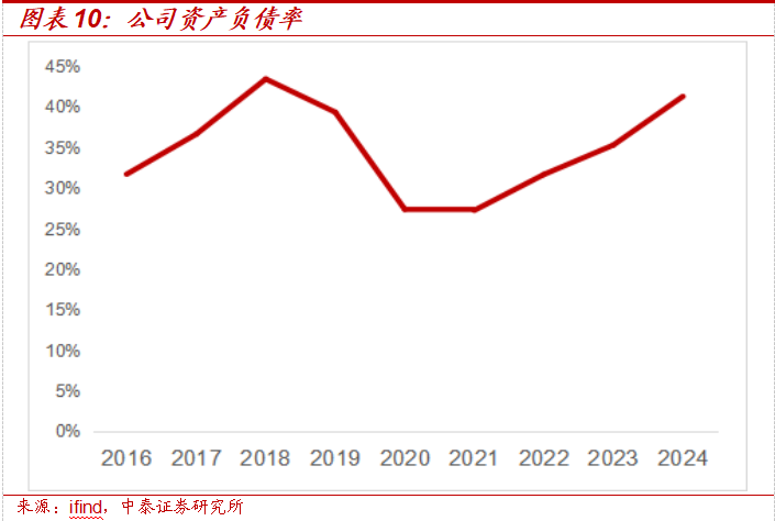 ◼公司资产负债率呈先升后降再升的态势。2016-2018年公司资产负债率逐年上升,2018年资产负债率达近八年最高值43.5%;2019年起资产负债率进入下降通道,2021年资产负债率降至近八年最低值27.3%;2022年起资产负债率又逐年上升,2024年资产负债率达41.3%,较2023年末上升5.99个百分点,主要系因本期公司总部基地建设投入增加长期贷款所致。