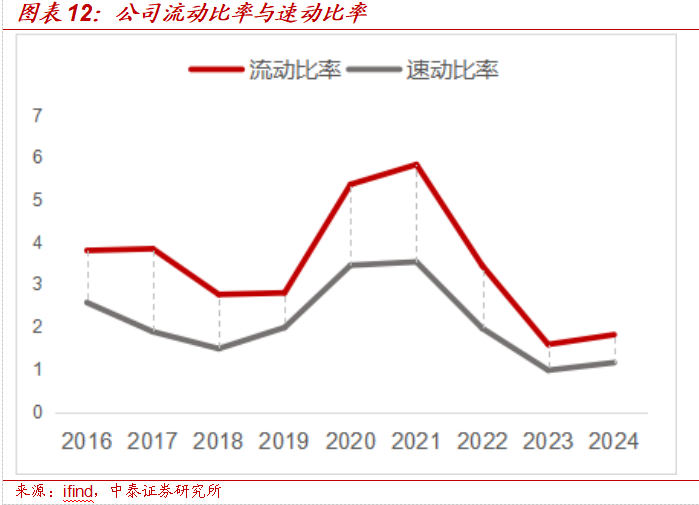 ◼公司流动比率、速动比率整体呈先降后升再降态势。2023年公司流动比率、速动比率分别为1.6、1.0,2024流动比率、速动比率分别升至1.8、1.2。主要原因系2024年公司短期借款同比下降24.46%,减少1591万元;同年公司获政府科研专项补贴4492万元。