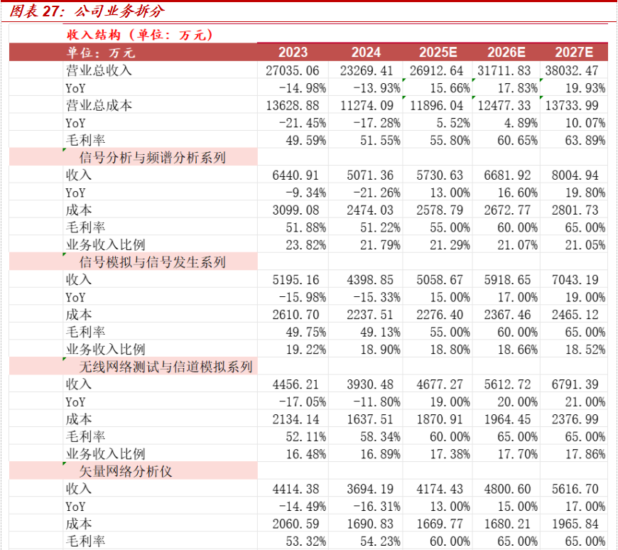 ◼ 矢量网络分析仪系列:属于公司核心业务(2024年收入占比为15.88%),2024年有可观收入。2025年半年度公司总营收同比增长18.44%,预计2025年全年矢量网络分析仪系列营业收入实现同步增长,未来我们认为市场逐渐呈现复苏迹象。参考历史增速情况,保守预计2025-2027年该细分业务收入分别同比增长13.0%、15.0%、17.0%。鉴于公司持续高强度的研发投入,及可比公司坤恒维顺类似业务近三年毛利率55.89%-66.47%,预计毛利率逐步改善,2024年为54.23%,2025-2027年分别为60.00%、65.00%、65.00%。