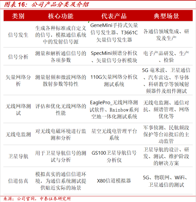 1)公司业务情况:技术自主研发,产品功能全面。创远信科作为自主研发射频通信测试技术的公司,专注无线测试仪器势能建设,拥有自主品牌和核心技术,集研发、生产、销售于一体。公司产品分为信号发生、信号分析、矢量网络分析、无线网络测试、无线电监测、卫星导航、信道仿真七大类,产品可针对通信测试的各领域需求,覆盖多场景测试。