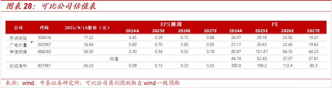 ◼ 我们选取通信测试领域公司,苏试试验、广电计量、坤恒顺维,作为可比公司。坤恒顺维与创远信科的测试设备高度相似,且均服务于通信设备制造商,形成直接竞争关系。苏试试验是一家工业产品环境与可靠性试验验证与综合分析服务解决方案提供商,服务于汽车、航空航天等对可靠性要求高的行业,与创远信科有业务交叉。广电计量作为第三方计量检测机构,在计量校准经营规模和服务能力居行业前列,具有代表性。