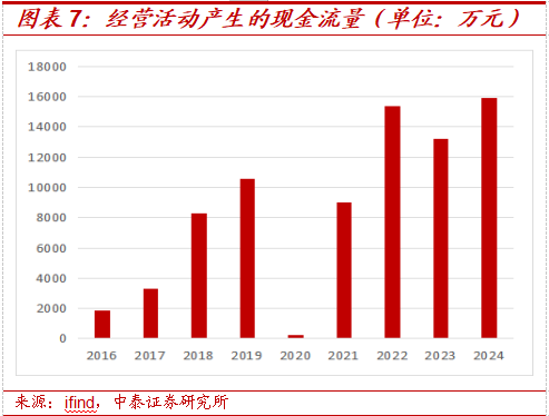 ◼ 公司经营性现金流充足,盈利质量扎实。公司2016-2019年经营性现金流逐年上升,2020年经营活动现金流降至 207万元,2021年回升至0.9亿元,2022年增长至1.5亿元,2023年回落至1.3亿元,2024年进一步增至1.6亿元,同比增长20.54%,创近九年新高,公司经营性现金流整体呈现波动上升趋势。2024年经营性现金流大幅增长主要源于同期收到政府补助4492万元,占全年现金流增量的28.16%。
