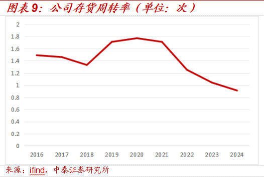 ◼公司存货周转率呈现先升后降趋势,2025年有望改善。公司存货周转率在2023-2024年显著下滑,原因系①公司主营业务需求疲软导致销售滞缓,公司主营的无线通信测试仪器业务受国内5G基站建设速度放缓影响,下游订单需求收缩。市场竞争加剧进一步挤压市场份额,2024年营收同比下降13.93%,归母净利润下降62.90%,直接反映产品销售速度放缓,存货积压加剧。②新业务尚未形成规模效应,车联网、卫星互联网测试等新业务处于市场开拓初期,研发投入对应的备货因市场验证周期长而拖累整体存货周转效率。