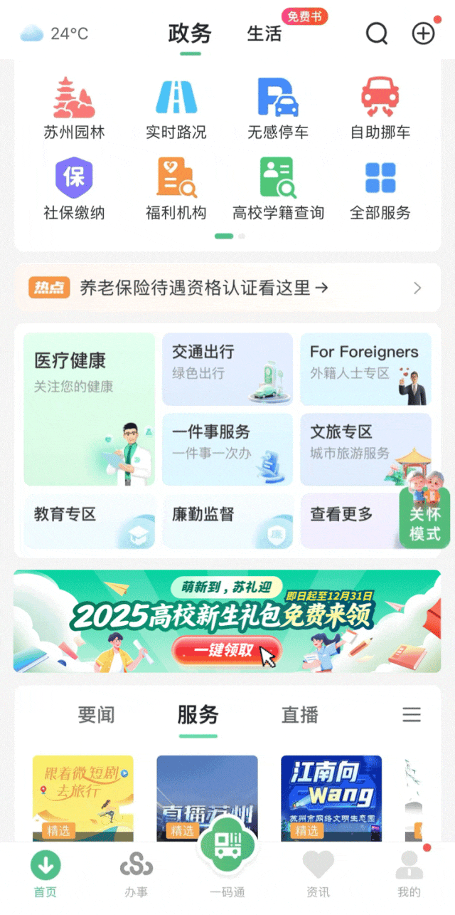 包含地铁与公交两类出行权益。地铁权益方面,新生下载“苏e行”App,凭兑换码可领取10次免费电子计次票;公交权益方面,新生在“苏周到”直接领取电子券,可不限次免费乘坐苏州大市范围内所有公交车。两类权益有效期均至2025年12月31日,助力新生便捷探索苏城。