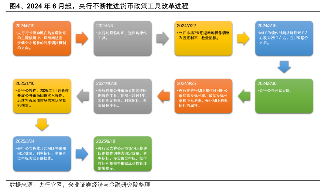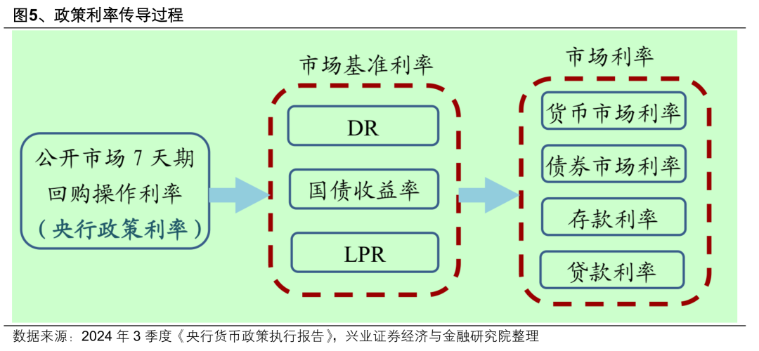 2024年6月央行行长潘功胜在陆家嘴论坛的发言提及利率市场化改革的方向,明确将7天逆回购操作利率作为主要政策利率,指出“其他期限货币政策工具的利率可淡化政策利率的色彩,逐步理顺由短及长的传导关系”。此后央行在货币政策工具方面公布了一系列改革措施,包括建立临时正、逆回购机制、开启国债买卖、启用买断式逆回购、MLF招标机制改革等,以期进一步完善“央行政策利率——市场基准利率——市场利率”的政策利率传导过程。