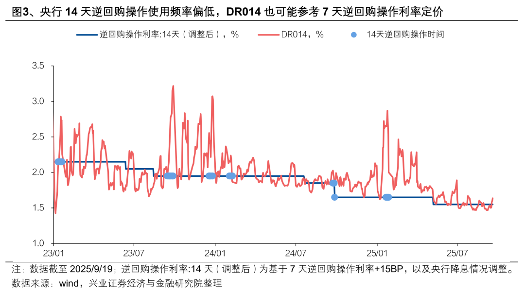 2)央行过去在7天逆回购操作利率的基础上构建利率走廊机制,引导DR007围绕政策利率波动,而14天逆回购操作利率并无类似机制,且操作频率偏低。实际运行中,DR014也可能更多地以7天逆回购操作利率为锚。央行构建的利率走廊以7天逆回购操作利率为基准,利率走廊上限为7天SLF操作利率,下限为超额存款准备金利率,引导DR007围绕7天逆回购操作利率波动。2024年央行进一步增加临时正、逆回购工具,进一步缩窄利率走廊宽度。而央行14天逆回购操作利率并没有设置配套的利率走廊机制,且使用频率偏低,对市场利率的引导作用偏弱。从DR014的实际运行来看,由于央行14天逆回购操作利率-7天逆回购操作利率利差长期基本稳定在15BP,DR014事实上也可能参考7天逆回购操作利率定价。